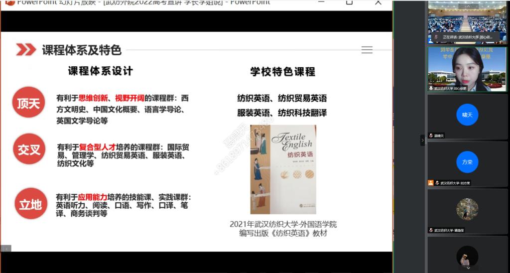 讲座伊始,纺大2022年招生宣传片大气霸屏,通过声与影的穿插,情与景的交融,为宜都一中师生生动展示了充满生机活力的美好纺大。