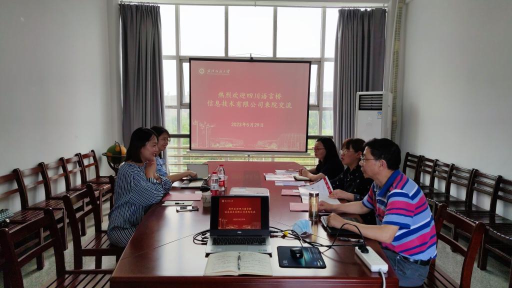 会议伊始,谭院长对朱总一行的到来表示欢迎,同时也回顾了与语言桥合作的历史。接着语言桥华中区区总朱曼曼播放了公司的宣传视频,接着她介绍了此行的来意。双方在学生实习实践、师资培训、图书翻译与出版等方面进行了深度的沟通与交流。谭院长指出学院高度重视校企合作和人才培养,并表达了进一步加强合作、拓宽合作领域的愿望。