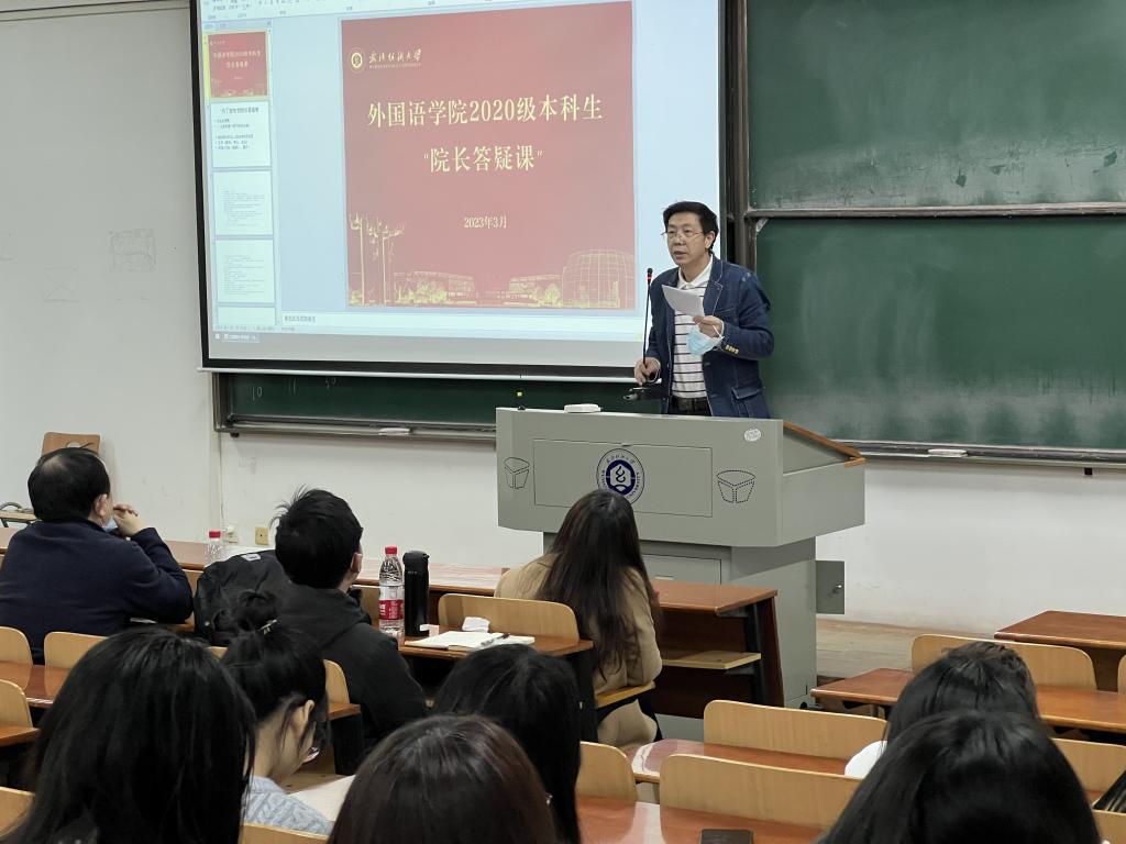 3月12日下午,外国语学院在崇志楼120教室开展2020级本科生“院长答疑课”,院长谭燕保主讲,院党委书记胡中原,副院长罗绮伦、刘方荣,党委副书记彭阳慈航,年级辅导员,班主任和全体20级学生参加。