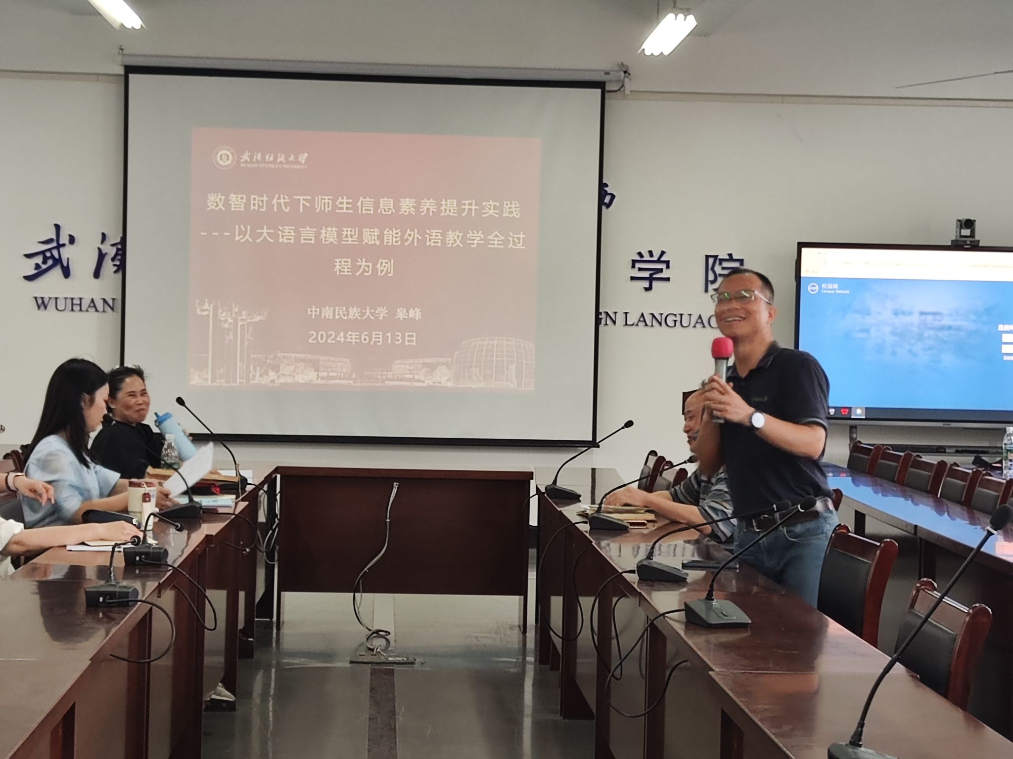 6月13日下午,应学院邀请,中南民族大学外国语学院皋峰副教授为外国语学院师生带来了一场精彩的学术讲座:数智时代师生信息素养提升实践---以大数据赋能外语教学全过程为例。