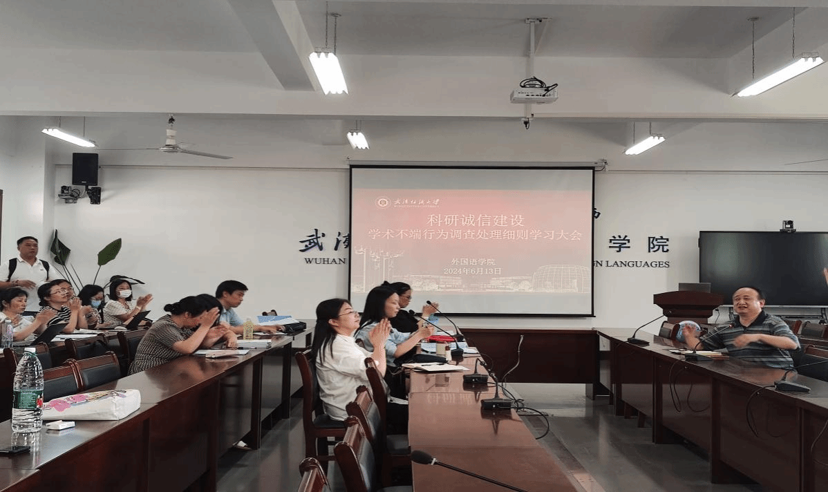 为响应学校倡议,营造良好的学术氛围,维护学术领域的纯洁性,6月13日,在04-303会议室,外国语学院召开了全院教师大会,集中学习由校学术委员会下发的学术不端调查处理细则,会议由副院长罗绮伦主持。