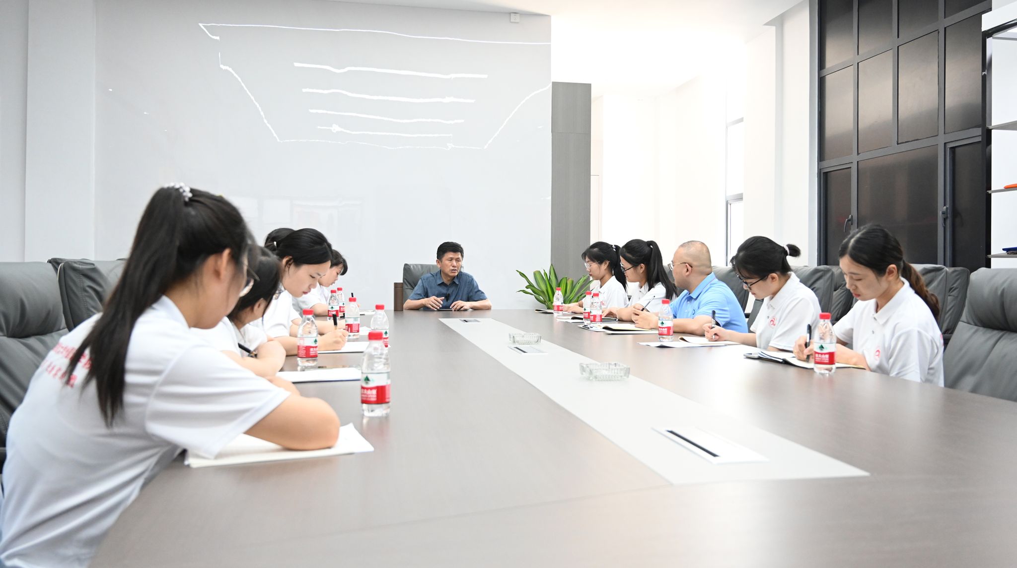 在恒瑞非织造材料有限公司,董事长刘城镇向实践团介绍,企业在发展历程中传承着“艰苦创业、无私奉献、团结协作、勇于创新”的三线精神。进入车间之前,严格的除尘程序便让同学们感受到企业对品质的高标准、严要求;而步入车间内部,全自动化生产的景象更是令人惊叹,每一台机器都精准高效地运转着,将一缕缕纤维编织成生活中不可或缺的无纺布。在刘城镇董事长的悉心讲解下,实践队员们亲眼见证了无纺布从原料到成品的神奇蜕变。