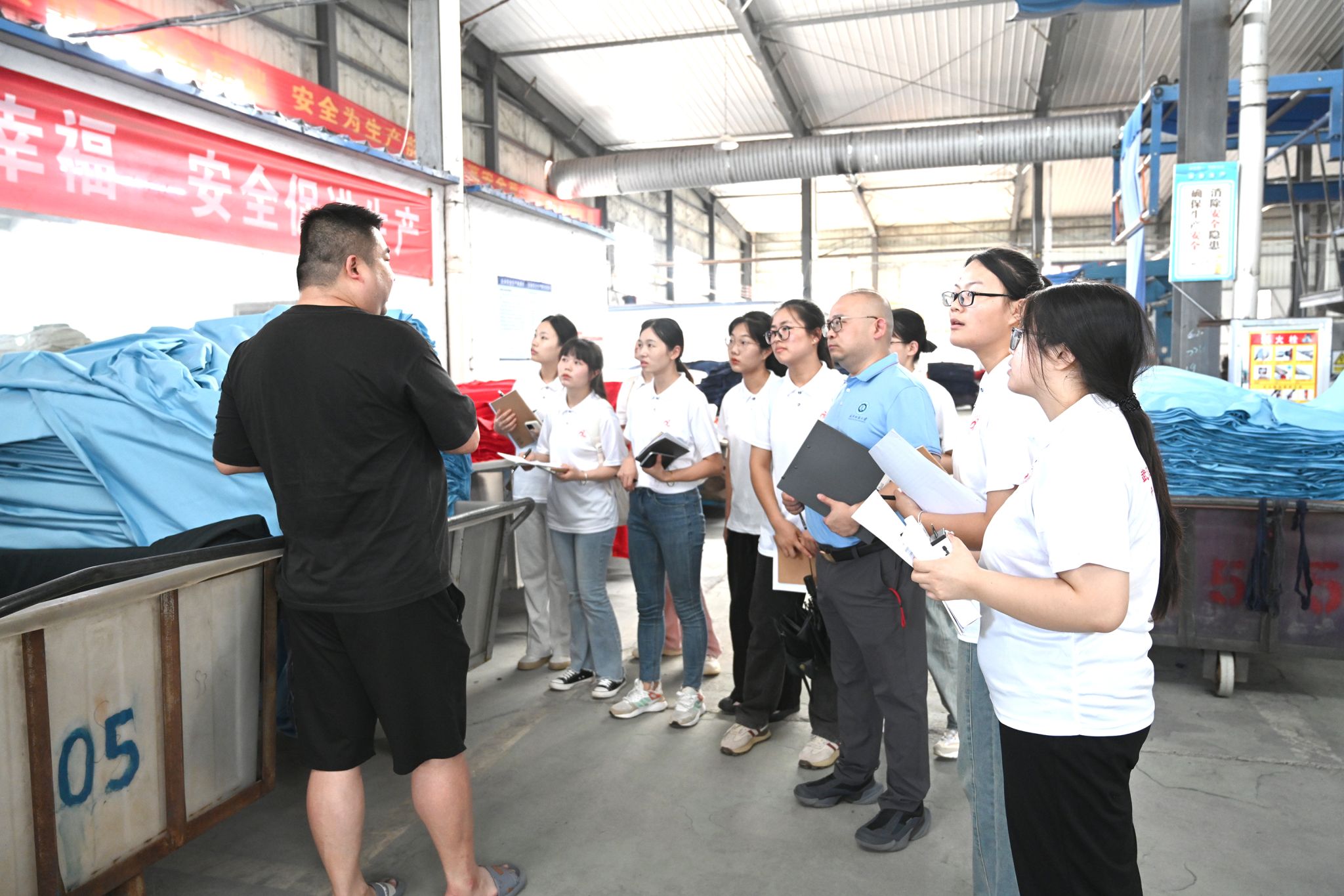研“习”之路实践团走进湖北祥源特种布有限公司,其前身为赤壁市特种用布厂,始建于1987年。时至今日,祥源特种已构建起梭织与针织两大阻燃产品系列的生产体系,双轨并行。在生产车间内,同学们详细了解了特种布的完整生产流程,从烧毛、退浆到染色、阻燃,直至去甲醛处理、拉幅、预缩,每一道工序都凝聚着纺织人的智慧与现代科技的结合。在特种布成品展示室里,负责人向同学们一一展示了各类特种布样品和成品,强调由阻燃布制作的消防服能有效阻止持续燃烧,能对消防作业人员起到很好的保护作用。