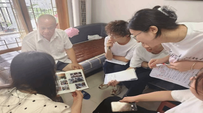 采访围绕尹关山先生的研究历程和阳新布贴的发展过程展开。尹老先生首先向我们解释了自己为何从事阳新布贴的研究,尹关山老师说:“自己从小就热爱画画,无论多苦多累,也要找个角落去写生。” 通过采访,实践团了解到,在1985年,湖北省文化厅为保护和挖掘省内民间文化遗产,动员全省文化系统的干部职工搜集“民间美术品”。动员会开过两个多月,全县收集工作竟杳无动静。身为阳新县文化馆美术干部的尹关山,有点着急。尹关山先生最朴素的想法是,阳新虽说是国家级的贫困县,但精神不能缺钙,工作不能被人瞧不起。33岁的他,告别妻儿,打起背包,走村串户,自己去寻找。