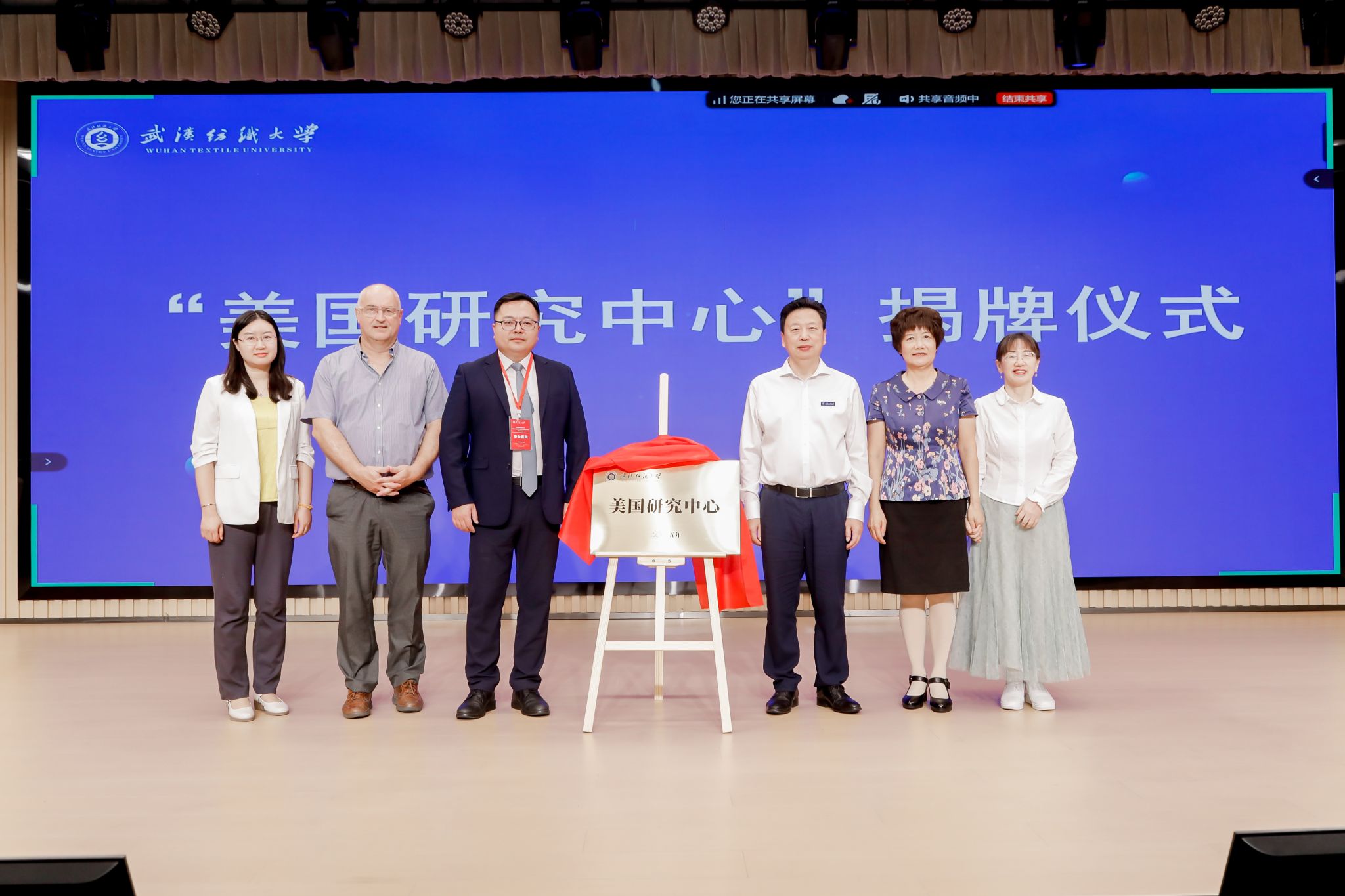 开幕式上,程碧海和陈靓共同为武汉纺织大学外国语学院“美国研究中心”(筹)揭牌。