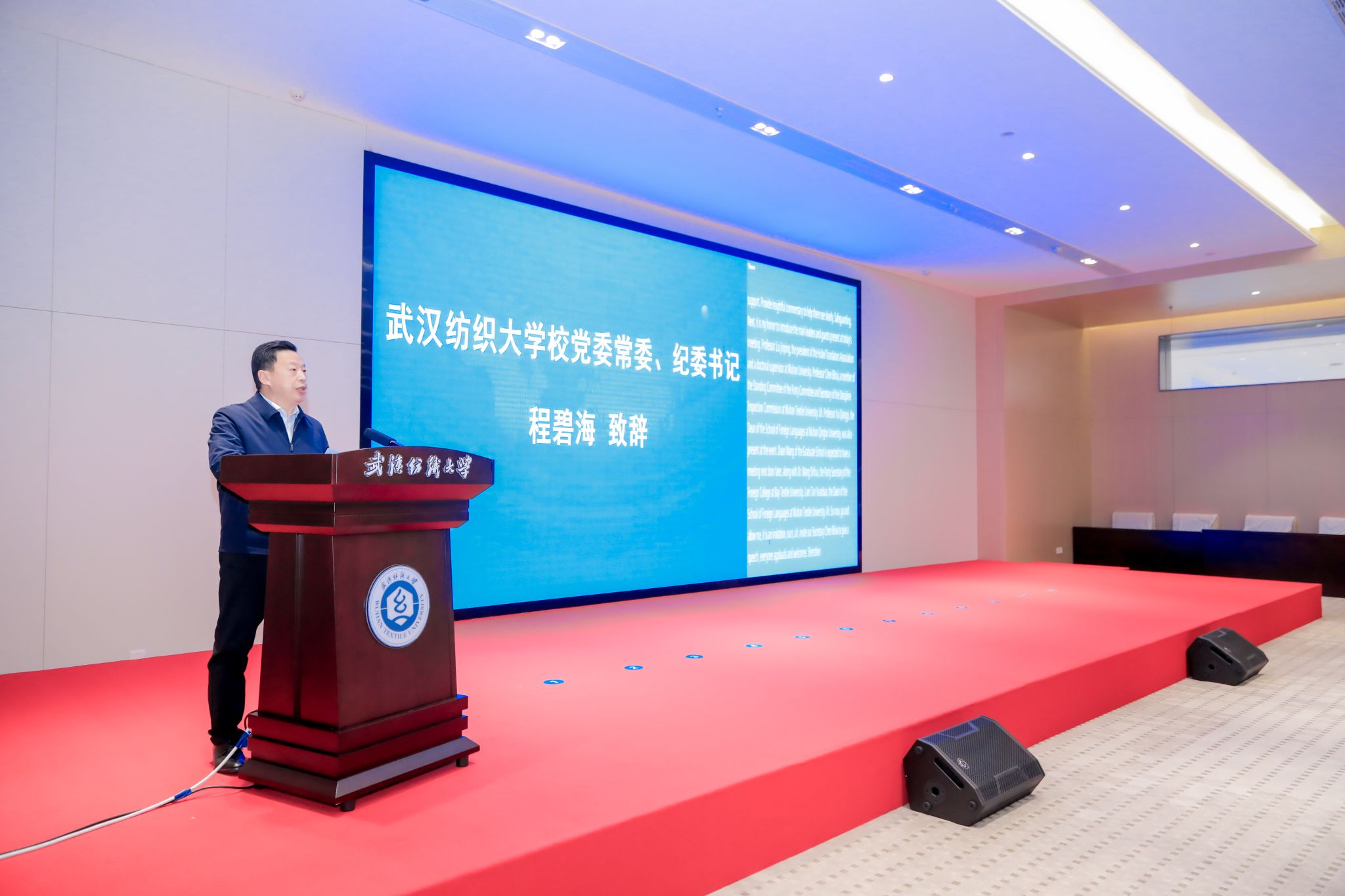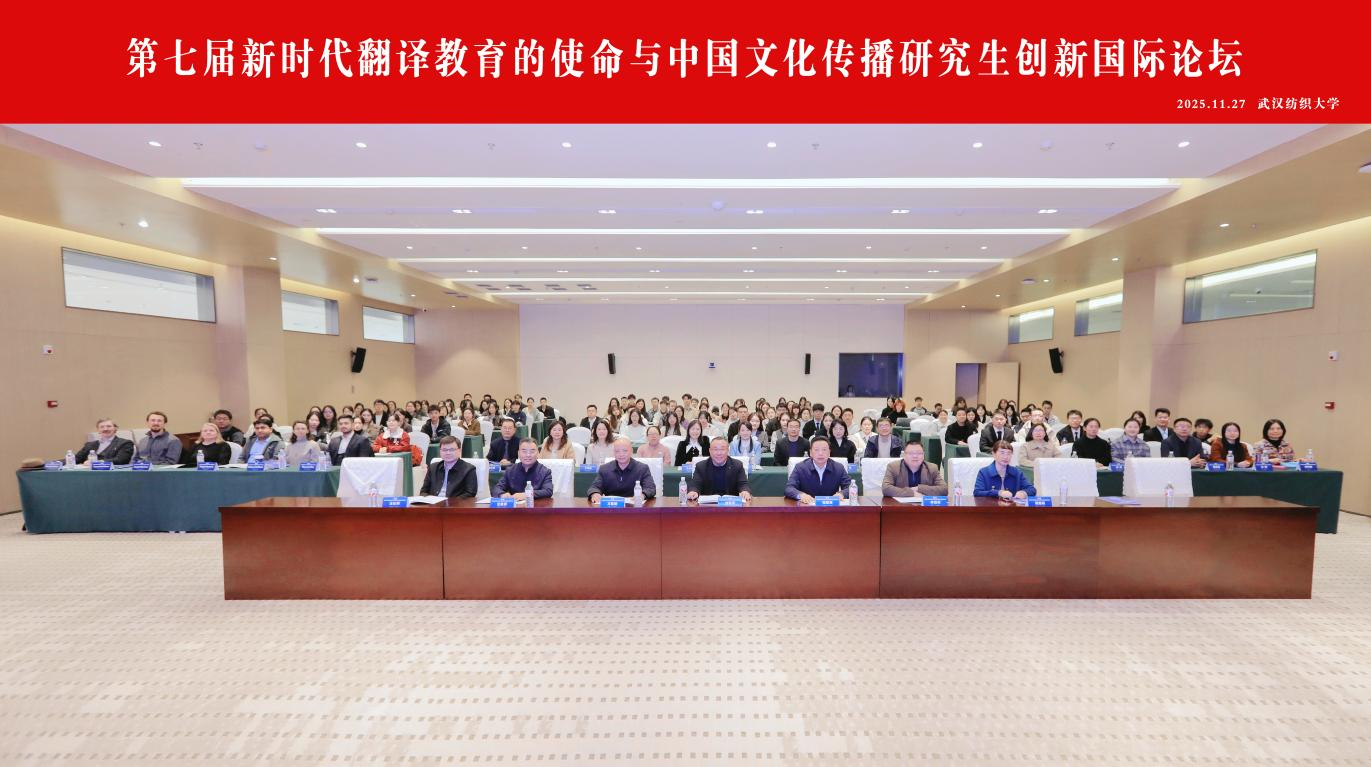 11月27日,第七届新时代翻译教育的使命与中国文化传播研究生创新国际论坛在武汉纺织大学阳光校区建全会堂成功举办。来自武汉理工大学、中南民族大学、湖北工业大学、武汉轻工大学和湖北中医药大学及武汉纺织大学的近百名师生及六位外籍教师共同参加了此次论坛,武汉纺织大学校党委常委、纪委书记程碧海、湖北省翻译工作者协会会长刘军平教授等受邀参会。