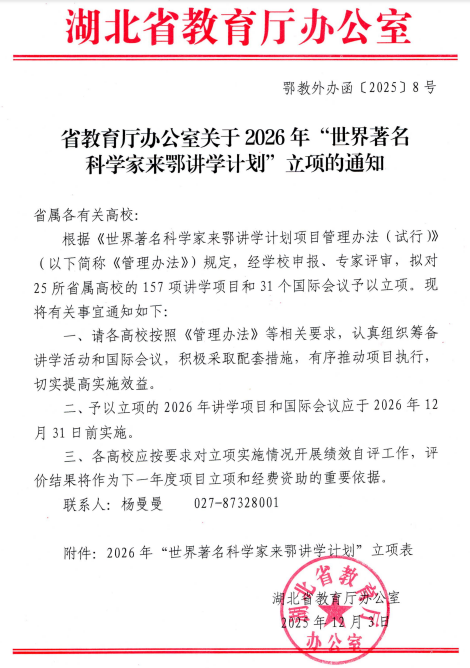 “世界著名科学家来鄂讲学计划”是湖北省教育厅为引进世界顶尖智力资源,促进省内高校与世界高水平大学、科研机构的学术交流与合作,提升高校学科建设水平和人才培养质量而设立的重要项目。