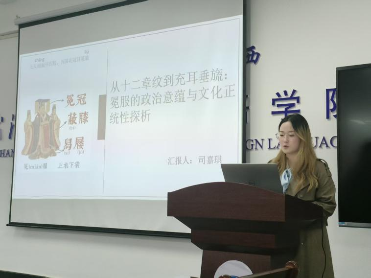 商英12301班学生司嘉琪则围绕“冕服的政治意蕴与文化正统性”展开探析。她梳理了冕服从夏商时期的祭祀服饰原型,到周代形成标准化制度的发展脉络,解析其形制构成的象征体系:冕冠的延板对应“天圆地方”的宇宙观,玉旒体现等级秩序,充耳蕴含对君主的道德劝诫;玄衣纁裳的色彩象征天地,十二章纹为帝王专属的身份标识。她强调,冕服不仅是“君权神授”的政治合法性符号,更是华夏正统文化的核心载体,历代政权常通过沿用或重构冕服制度,确立自身的文化传承地位。
