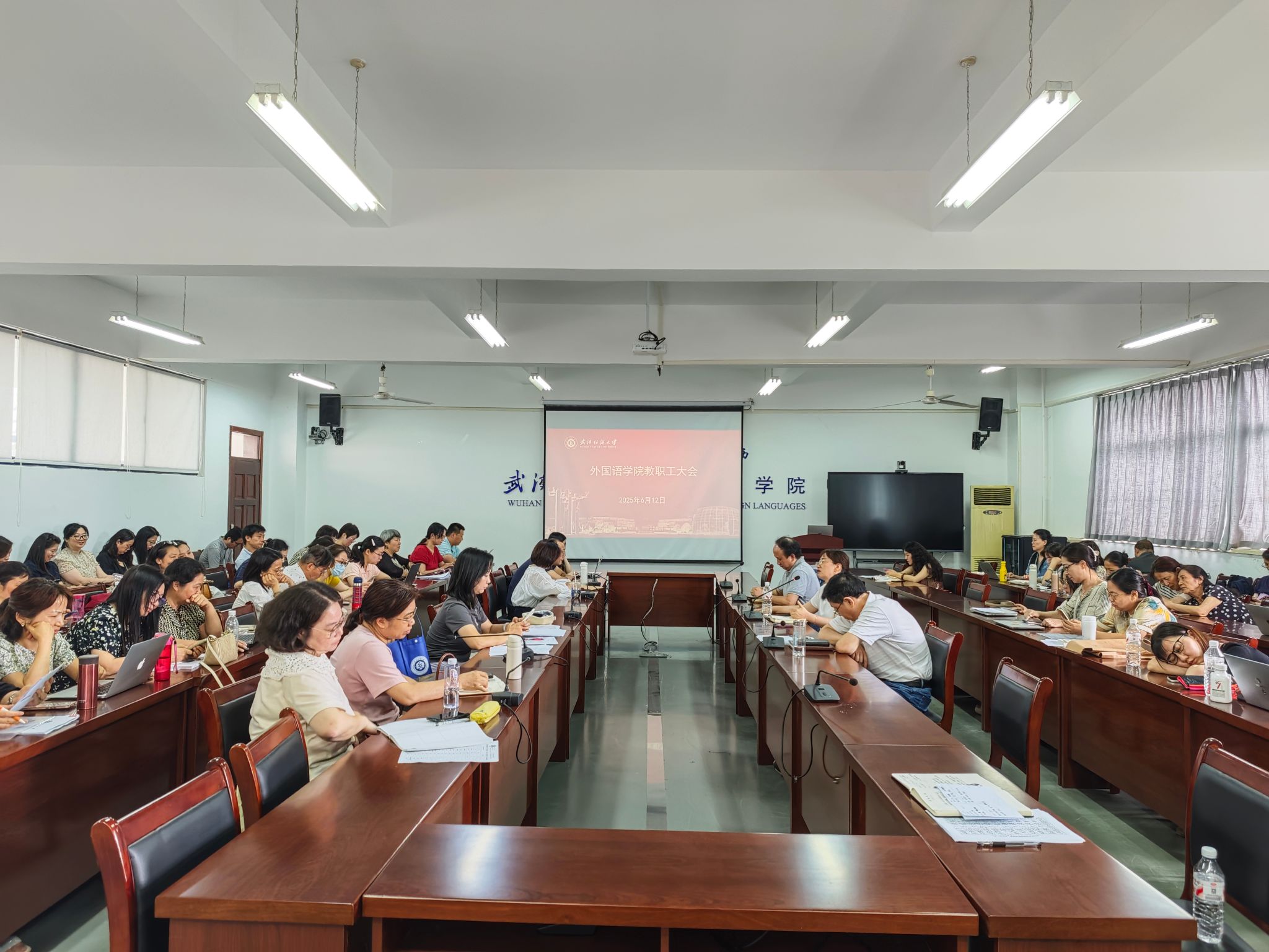 6月12日下午,外国语学院在04-303会议室召开全体教职工大会,开展政治理论集中学习,学院党委书记胡中原主持会议,全体教职工参加会议。
