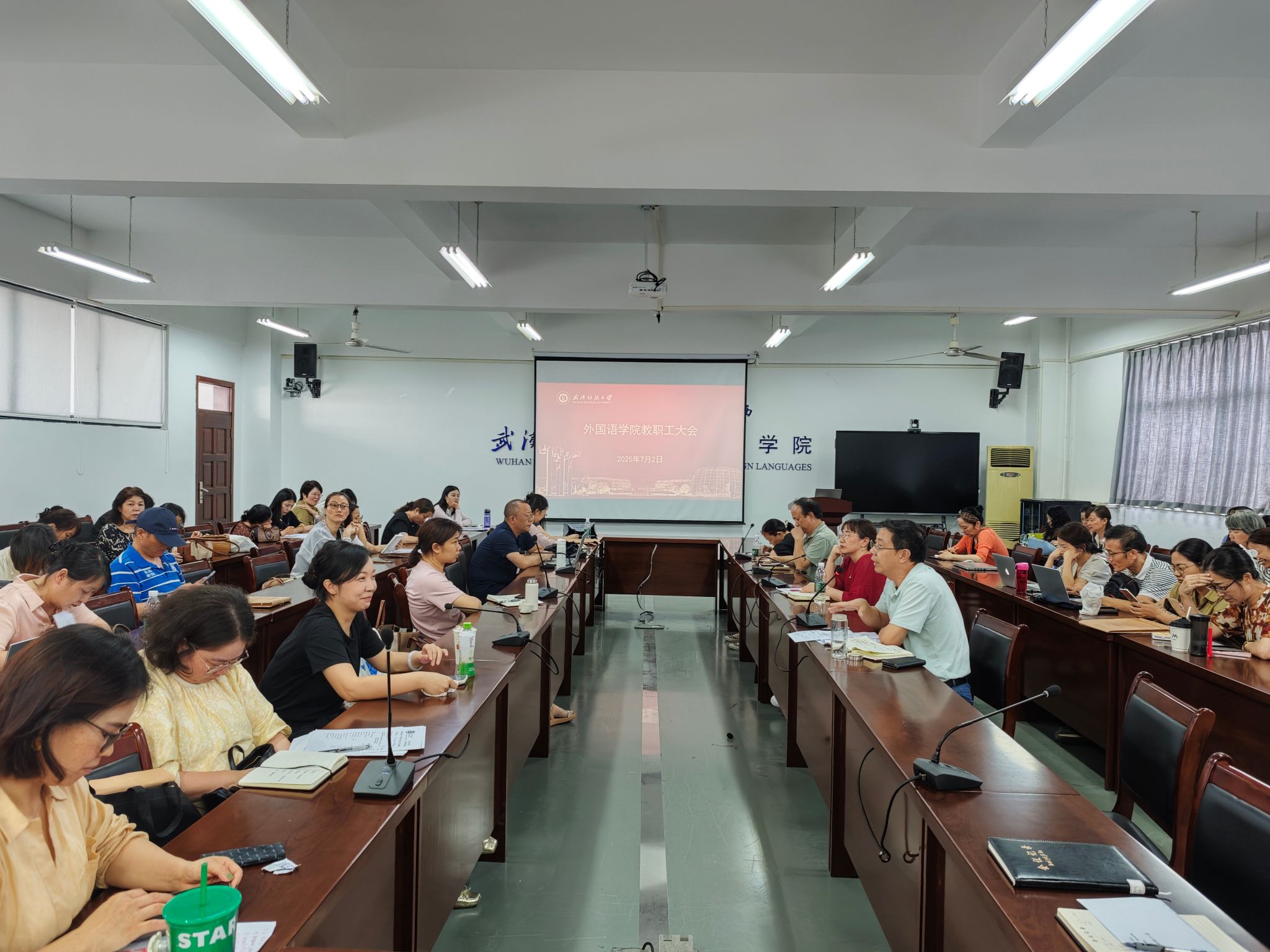7月2日下午,外国语学院在04-303会议室召开全体教职工大会,开展政治理论集中学习,学院党委书记胡中原主持会议,全体教职工参加会议。