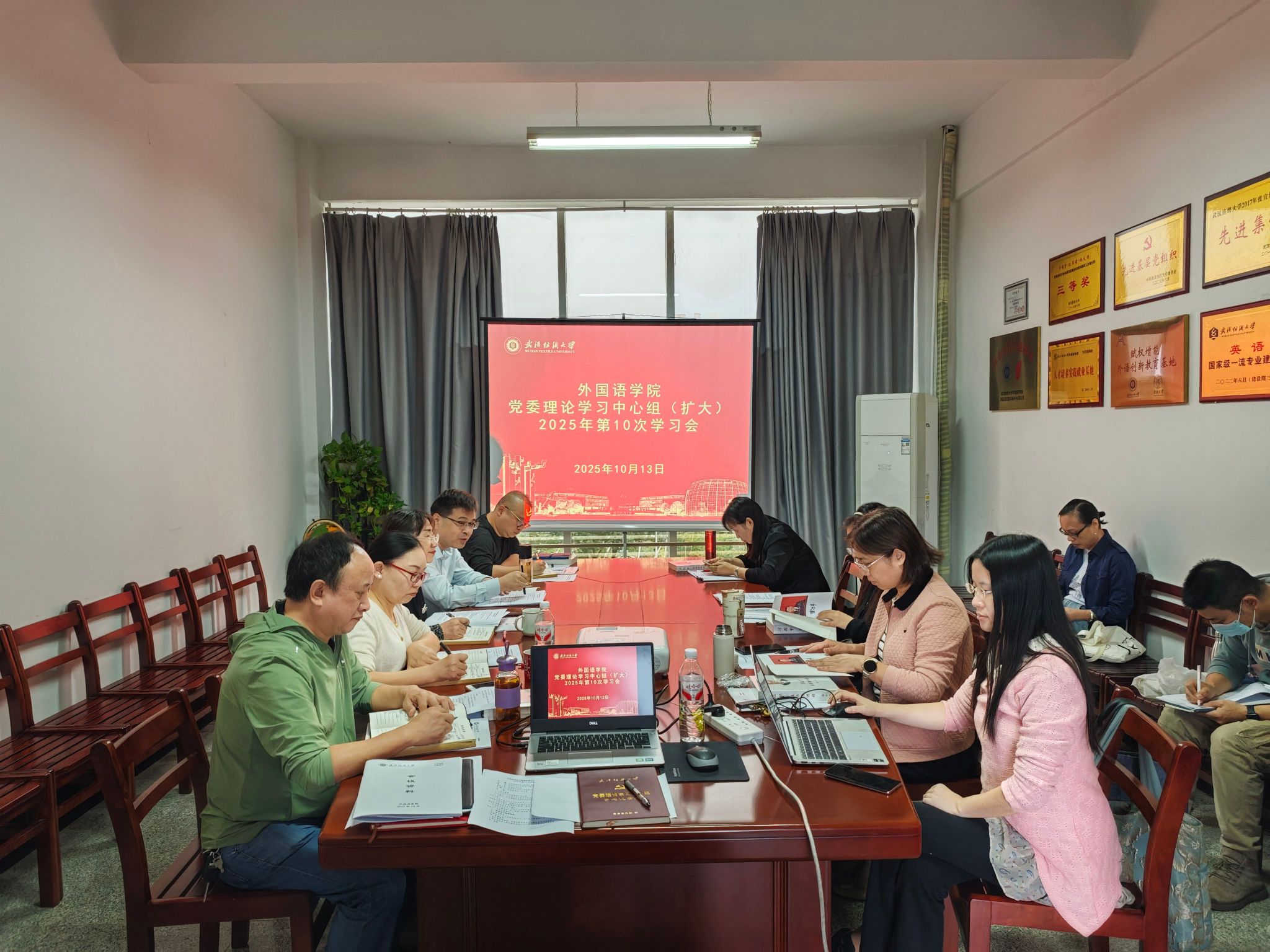 10月13日上午,外国语学院党委理论学习中心组(扩大)学习会在04-313会议室召开,本次学习会的主题是学深悟透党的创新理论最新成果 引领事业高质量发展,学院党委书记汪仕辉主持会议,院长谭燕保、副院长罗绮伦、刘方荣、副书记彭阳慈航、党委委员、党支部书记、系(部)主任参加会议。