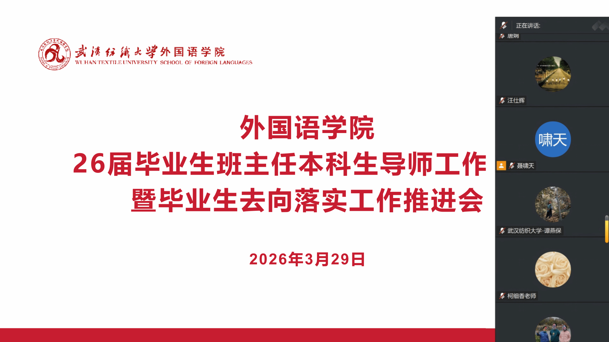 为精准做好毕业生就业分类指导与服务工作,3月29日晚,外国语学院通过线上平台举行毕业班班主任工作会暨毕业生去向落实工作会。学院领导班子全体成员、毕业班班主任、本科生导师及毕业年级辅导员参加会议,会议由党委副书记彭阳慈航主持。