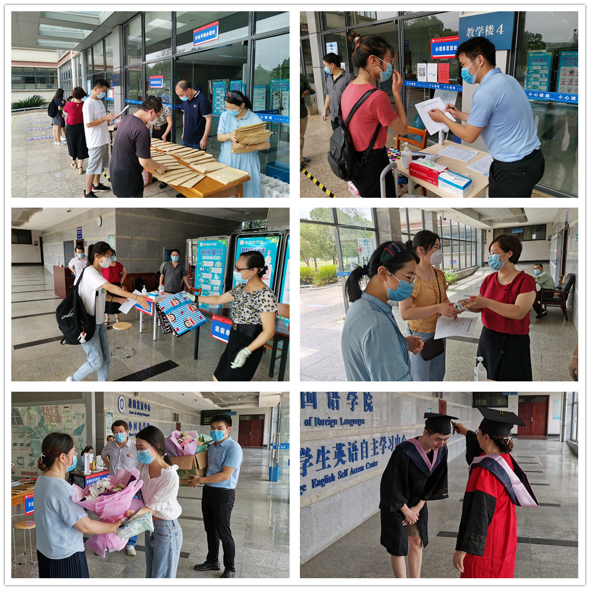 千里归来情愈切,此心安处是纺大。6月15日起,外国语学院2020届毕业生在离别学校5个多月以后,开始陆续返校。学院领导、系部教师、管理人员全员保持在位,全程为毕业生返校工作保驾护航。