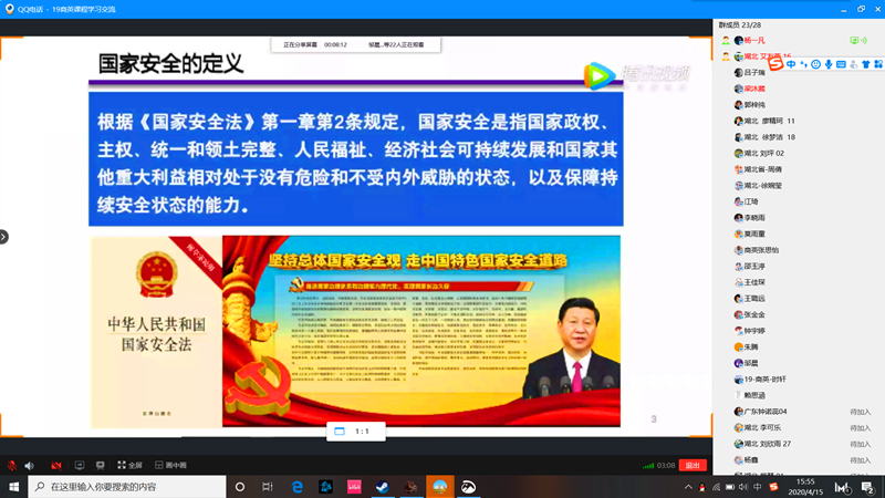 4月15日是第五个全民国家安全日,外国语学院结合全球新冠疫情防控形势,统筹传统安全和非传统安全,通过开展各年级各班“云”上主题班会的形式,宣传国防安全、总体国家安全观和国家安全法律法规,提高青年大学生的维护国家安全的自觉性和主动性。