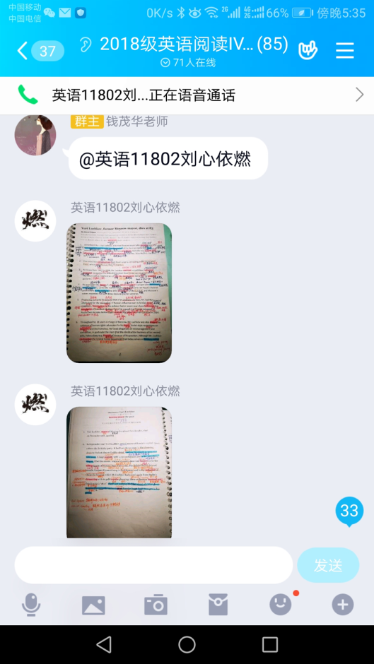 谭燕保教授的一堂“翻译名著赏析”给人印象深刻,从《红楼梦》人物性格分析,到翻译风格、翻译标准的诠释,再到翻译背景的欣赏,非常自然导入知识点,课堂设计精湛,近2小时的授课,从课前提前15分钟的NPR美国在线新闻热身,到课中知识点的导入,再到作业的布置,采用企业微信授课信息量大,与学生互动频次多,使学生感觉授课内容很有趣,获得感强,反映老师深厚的文学功底,授课精湛。