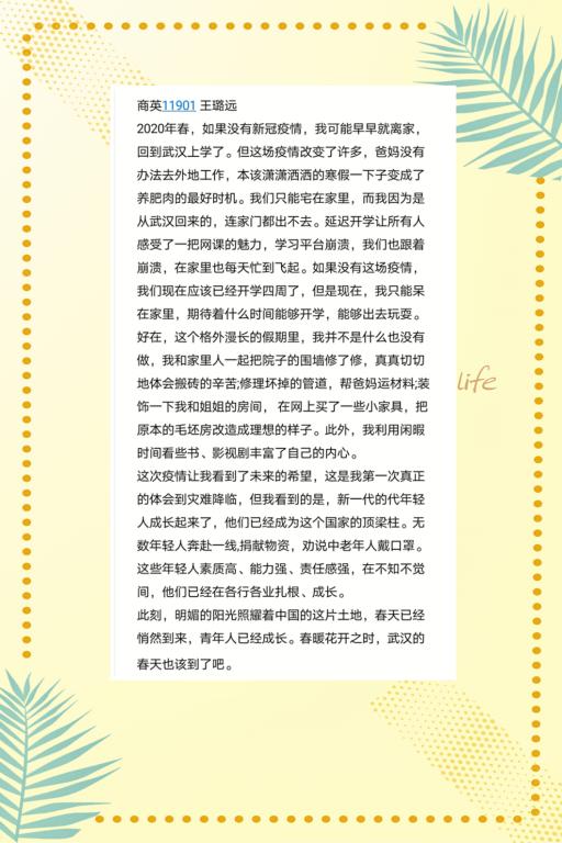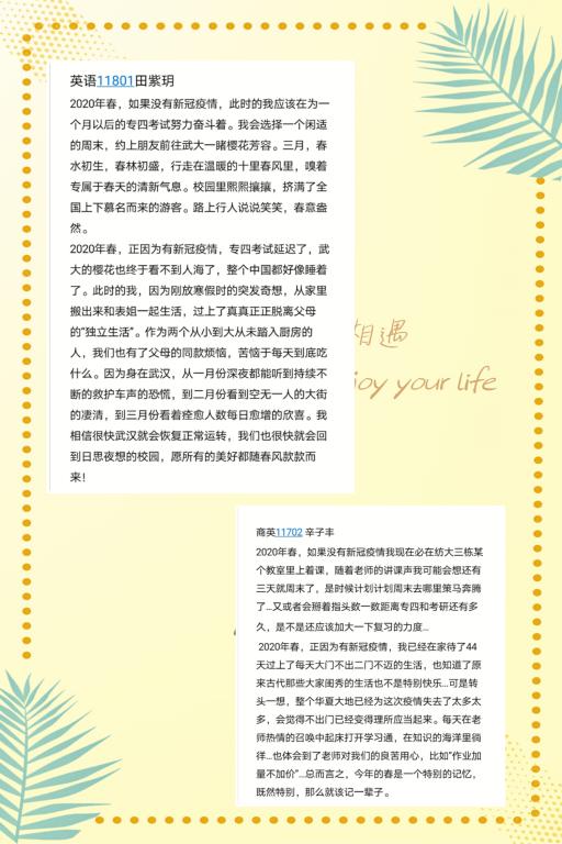 本次活动,依托网络,以班级为单位,同学们按照指定顺序,以“2020年春,如果没有新冠疫情,我会在…。2020年春,正因为有新冠疫情,我…” 进行造句,写一段疫情期间的感悟,字数不限。通过填空造句的形式,引导同学们牢记学生本位的身份,安心开展特殊新学期线上课程与线下家中个人学习生活计划,同时帮助同学们释放压力,花时间去思考,去发现家人相伴的爱与温暖,为今后离家返校积蓄力量。这个活动一经推广,立刻在各年级学生中产生强烈共鸣,特别是各班级内部,弥补了因疫情无法见面相聚的遗憾,加深全国各地同学间的友谊,大大增强班级凝聚力。