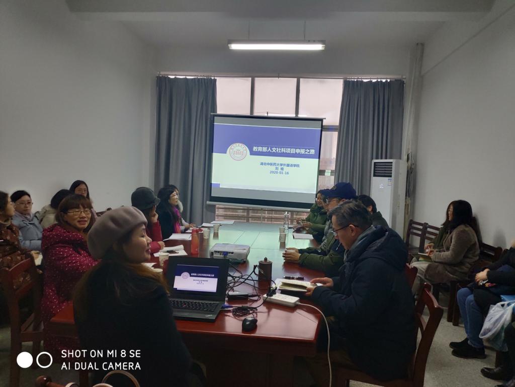 为进一步做好国家社科基金项目、教育部人文社科项目申报工作,满足科研加班期间学院教师的申报需求,提升学院教师的申报能力及申报课题的理论水平,外国语学院组织老师进行了集中研讨。2020年1月16日上午,湖北中医药大学外国语学院院长刘娅教授应邀来我院做题为“教育部人文社科项目申报之路”的精彩讲座。本次讲座由外国语学院院长谭燕保教授主持,外国语学院副院长柯群胜教授等学院部分领导及教授、教师们参与了本次讲座。
