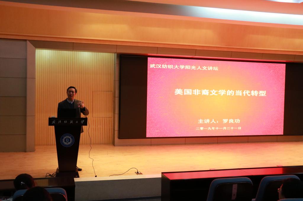 11月21日下午,由校团委主办、外国语学院承办的第213期阳光人文讲坛在我校阳光校区国际学术报告厅举行。本次讲坛邀请了华中师范大学外国语学院院长、教授、博士研究生导师罗良功教授,为同学们带来题为“美国非裔文学的当代转型”的讲座,外国语学院全体领导班子成员、部分老师和阳光校区300余名学生聆听了讲座。讲座由外国语学院院长谭燕保主持。
