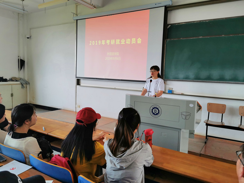 9月6日下午,外国语学院在3号教学楼416教室开展学院2019年考研就业动员会。外国语学院院长谭燕保教授、副院长柯群胜教授、毕业班辅导员阎浩老师出席。学院全体2016级学生参加了动员会。