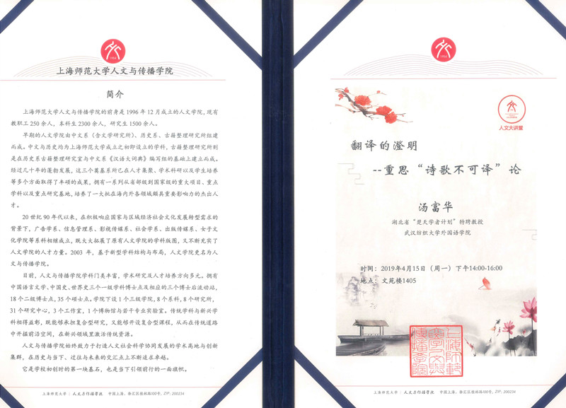 近日,应国家重点学科上海师范大学比较文学与世界文学研究中心邀请,外国语学院“_”特聘教授、湖北省比较文学学会副会长汤富华教授赴上海师范大学作题为《翻译的澄明:重思诗歌不可译论》学术讲座。汤富华教授以其广博的学识、幽默的语言,深入浅出地为师生们梳理了翻译学科的缘起及发展,以比较文学的视角,哲学的方法论,从形而上与形而下两个维度,阐释了翻译的本质,对翻译学科的发展方向,提出了自己独到的见解。