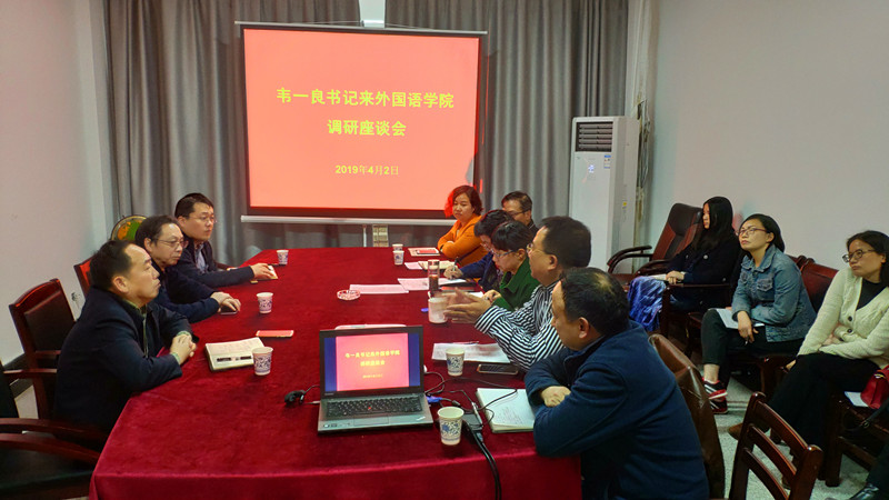 4月2日下午,校党委书记韦一良在研究生处、学校办公室负责同志陪同下,到外国语学院调研指导工作。外国语学院全体班子成员、“_”特聘教授汤富华及教师代表参加了调研座谈会。