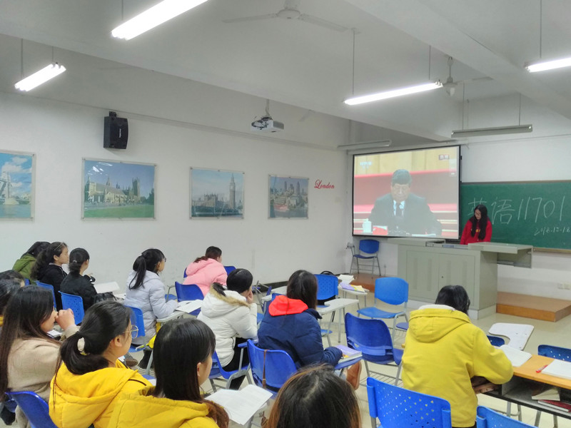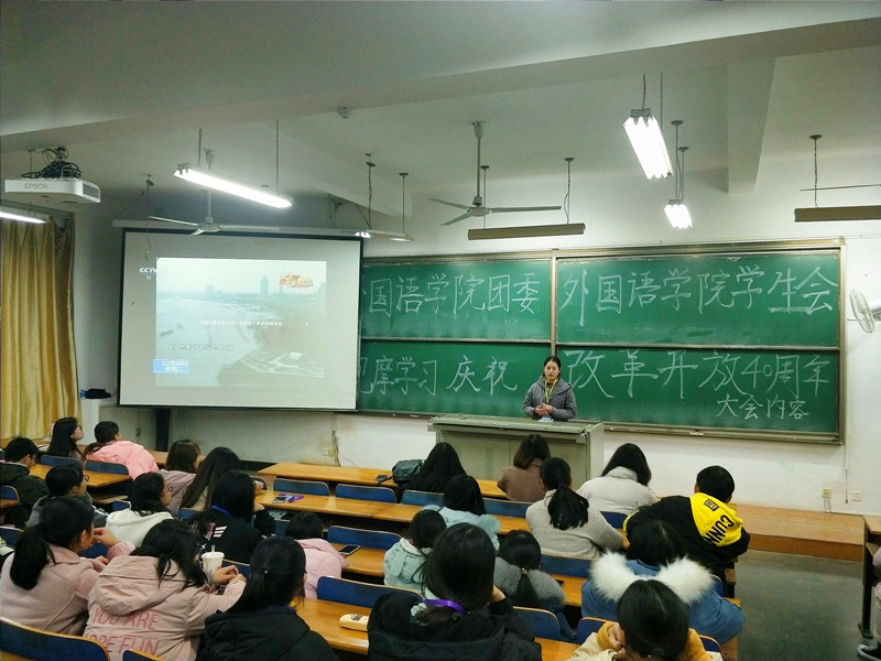 12月18日,外国语学院党委行政班子、学院团委学生会、各班级团支部分别组织观看了“庆祝改革开放40周年大会”视频直播,师生紧密围绕受表彰人物事迹和习近平总书记会上的重要讲话精神开展学习、交流,为学院创新、改革、发展积极献言建策。