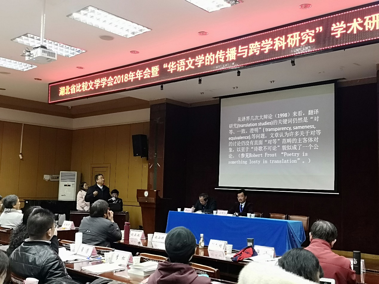 湖北省比较文学学会2018年年会暨“华语文学的传播与跨学科研究”学术研讨会于12月8日在武汉中南财经政法大学举行。本次研讨会由湖北省比较文学学会和中南财经政法大学新闻与文化传播学院联合主办。我院院长谭燕保教授、汤富华教授应邀出席大会并进行学术交流,钱茂华老师、华敏老师以及学院三名研究生参与此次论坛进行学习。