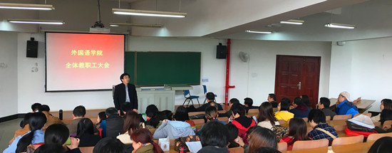 3月4日上午,外国语学院组织全体教职工在7教T201召开2018年新学期工作部署会,会议由学院党委常务副书记胡中原主持。会议特别邀请了校教务处处长何畏教授出席。