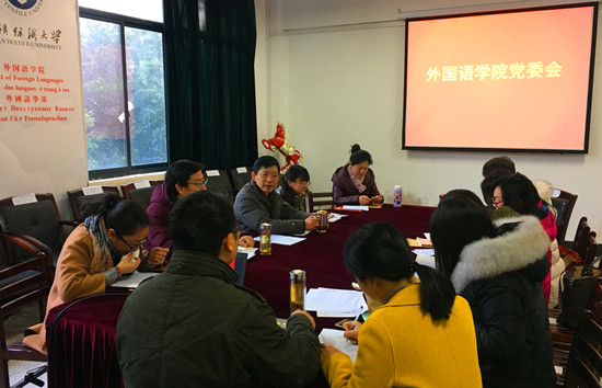 12月22日下午,外国语学院党委在学院会议室组织8名党支部书记进行年终工作述职。学院党委书记、院长何畏,学院党委常务副书记胡中原,副书记张鹏以及全体党委委员,6名教工党支部书记,2名学生党支部书记出席会议。会议由何书记主持。