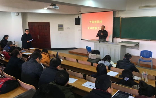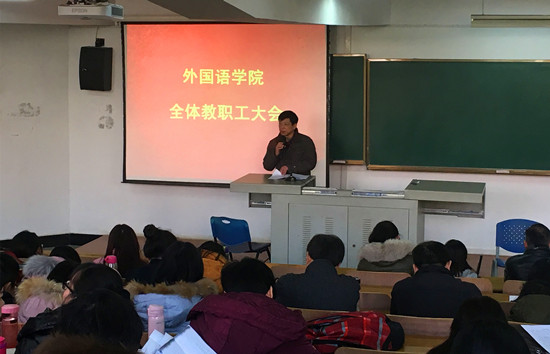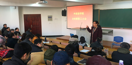 12月21日,外国语学院全体教职工大会在7教T201教室顺利召开。校党委统战部常务副部长吴吉喜,外国语学院全体班子成员出席会议,学院全体教职工参会。会议由学院党委常务副书记胡中原主持。