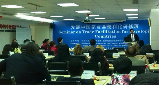 11月4日下午,由中华人民共和国商务部和联合国贸易与发展会议主办,湖北中欧国际职业教育培训中心(CEVTC)承办的“2015年发展中国家贸易便利化研修班”国际会议活动闭幕式在CEVTC中心举行。此次活动历时一个月,共有来自古巴、坦桑尼亚、尼日利亚等20多个发展中国家的43名政府官员参加。本次活动的外事接待和随团翻译工作由武汉纺织大学外国语学院和武汉纺织大学口译队完成。