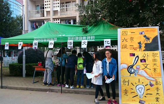 各食堂展棚处的宣传工作紧张有序的进行着。学院不仅通过发传单和学生解说的方式进行宣传,而且借助音响的魅力吸引学生的注意,广纳爱听爱唱外文歌曲的同学前来“参战”。为保证本次活动的顺利进行,我院秉承学习国外优秀文化的宗旨,学院领导及老师带领学生会成员共同打造了外文歌曲大赛的舞台,在这硕果累累的金秋日子里,,在朝气蓬勃的纺大中,张扬着自己的青春,献上一首首深入人心的外文歌曲,学校的相关领导与广大师生将共同奔赴这场视听盛宴。