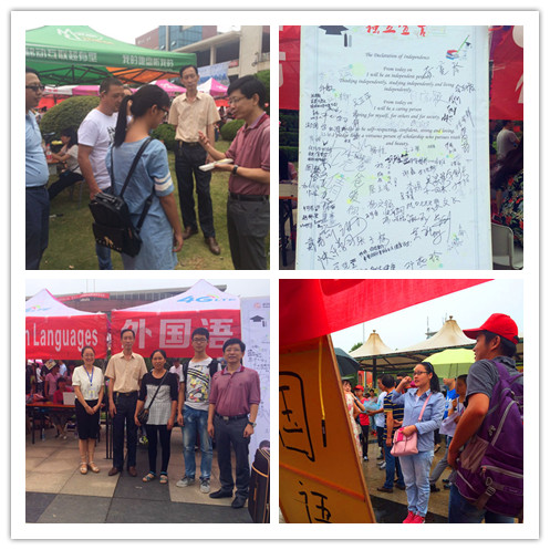 9月12日,旭日初升之际,校园里处处洋溢着青春的“乐动力”,武汉纺织大学2015年现场迎新工作正式拉开帷幕。在纷繁多彩的迎新亮点中,外国语学院的“全英文迎新”独树一帜,令前来报到的新生及家长们耳目一新:英文原版书籍赠阅,全英文“新生独立宣言”签名墙,与新生用英文进行全程交流……让新生在享受、体悟英语语言魅力的同时,对学院致力打造的的全方位育人模式有了更深的认识和更多的认同。