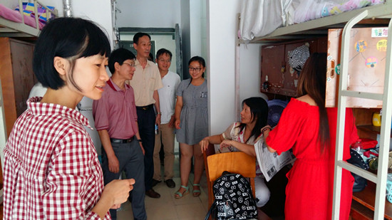 9月12日下午,学院班子成员及2015级新生导师代表、全体辅导员、学院办公室人员由院长何畏教授和分党委书记陈利民教授带队,深入走访了每一个新生的寝室,亲切看望2015级新生。