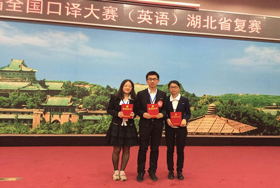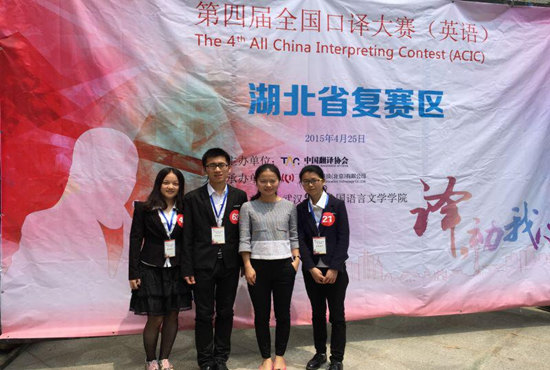 4月25日,第四届全国口译大赛湖北省复赛在武汉大学外国语言文学学院学术报告厅举行。我校外国语学院曹婷老师带领外语学院学生王鹏远、余丹、文雅玲参赛,与来自湖北省其他各大高校的另外69位选手进行角逐。最终,王鹏远同学以第十二名的成绩荣获二等奖,并顺利晋级将于5月9日在湖南大学举行的第四届全国口译大赛华中大区决赛,余丹、文雅玲同学也凭借出色的发挥获得三等奖。