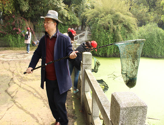 (汤富华和学生志愿者们一起进行志愿捞浮萍活动)