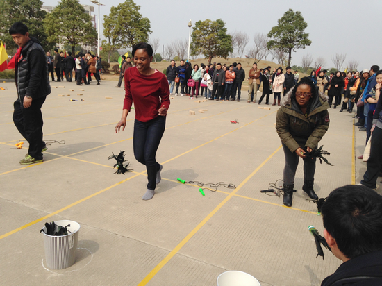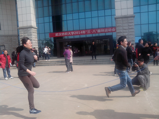 3月13日下午1点,学校工会组织全校教职工在阳光校区图书馆后空地举行了“三八趣味运动会”。外国语学院何畏院长、陈利民书记、向荣副院长、张鹏副书记、张红、柯细香等教师代表和来自牙买加的外教Kareima、Kareen一起参加了比赛。比赛分为单人项目(趣味接力)和集体项目(3分钟“8”字跳长绳比赛)。