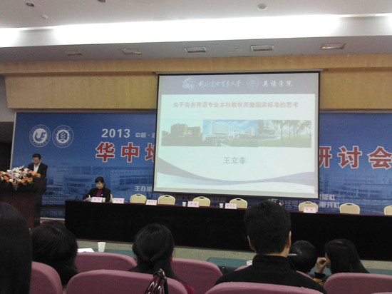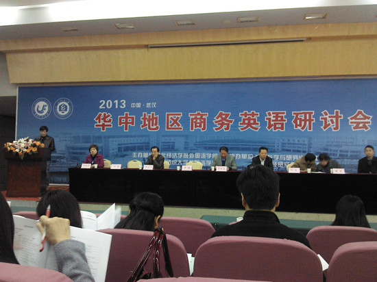 冬日暖阳,汤逊湖畔。为促进学术交流,探讨商务英语学科发展思路、商务英语专业建设及人才培养等相关问题,2013年11月30日,由我校外国语学院和湖北经济学院外国语学院联合主办的2013华中地区商务英语研讨会在湖北经济学院隆重举行。来自对外经济贸易大学、宁波诺丁汉大学、中南财经政法大学、河南财经政法大学、桂林电子科技大学、等省内外40多所高校的专家教授以及湖北经济学院和我校外语学院教师代表参加了大会。大会由湖北经济学院外国语学院何明霞院长主持。武汉纺织大学外国语学院何畏院长应邀在大会上致辞。