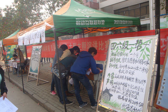近日,在阳光校区一食堂侧门外语学院英语志愿者服务基地和学生会志愿者协会联合开展了第七届外语文化节之大学英语四六级“Hand in Hand一帮一”问卷调查反馈活动,搜集同学们今年上半年参加外语学院英语四六级“一帮一”志愿者活动反馈意见和建议,评估活动效果。