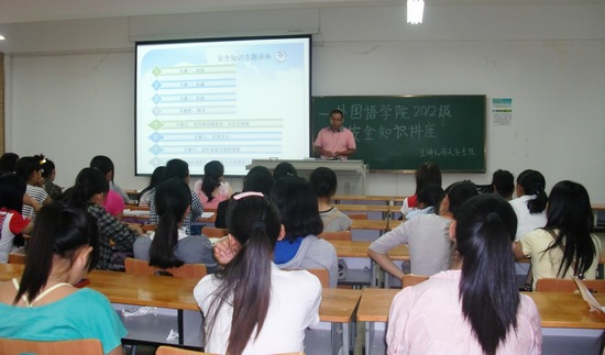 学校保卫处尚天飞老师从新生角度出发,用诙谐幽语的言语,详实生动的事例对广大新同学进行安全教育。他解读了《学生伤害事故处理办法》、《普通高等学校校园秩序管理若干规定》、《中华人民共和国治安管理处罚条例》,分析武汉市江夏区治安状况、校园周边环境的情况,提醒同学们高度重视的安全防范。尚老师还介绍了大学学习生活自我防范、自我保护的知识与措施,内容涵盖防火逃生、防偷盗、防骗防抢、出行安全及提防非法传销组织等,并结合近几年惨痛的实例教训,给新生同学们敲响警钟。