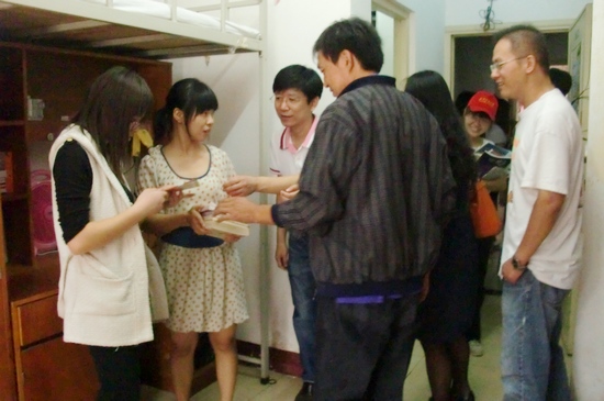 与此同时,学院领导、老师还开展了走访慰问活动,给他们送去了诚挚的问候和亲人般的关怀。“孩子们,欢迎你们来到外国语学院!”何院长走访学生宿舍,热情地与2012级新生打招呼。突然看见这么多关切、和蔼的面孔,同学们脸上掠过一丝惊讶,得知院领导来看望自己时,他们都激动地鼓起掌来。领导们亲切的跟同学们拉起家常,“孩子,老家是哪里的?”“对学校还满意吗?”“学校饭菜还可口吗?”“爸爸妈妈都回去了吧?”“中秋节记得给家里打电话”一连串的问候中包含着关切。卫书记叮嘱同学们要照顾好自己,注意安全,有困难及时向院里和学校反映,学院会尽力帮助解决。亲切的问候,关切的眼神,使同学们感受到家庭般的温暖,同学们兴奋地向领导和老师讲述自己对学院的感受、对大学生活的期待。据悉,外语学院昨天上午就开展了慰问走访活动。