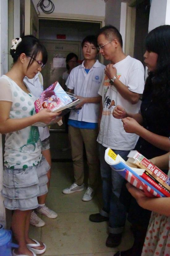 9月10日上午10点,外国语学院学生党员、分团委学生会干部、高年级同学手里抱着一摞摞课外优秀中英文图书和笔记本,跟随外国语学院学院长何畏、副院长柯群胜、副书记卫冬妹、专业课教师钱茂华和辅导员一起走访慰问了学院2012级新生宿舍。同时,开展了“图片漂流”活动,向每位新同学“漂流”了一本学院师生捐赠的精品图书,并赠送了笔记本,温暖了新生的心灵,增进了师生友谊,架起了师生“连心桥”。