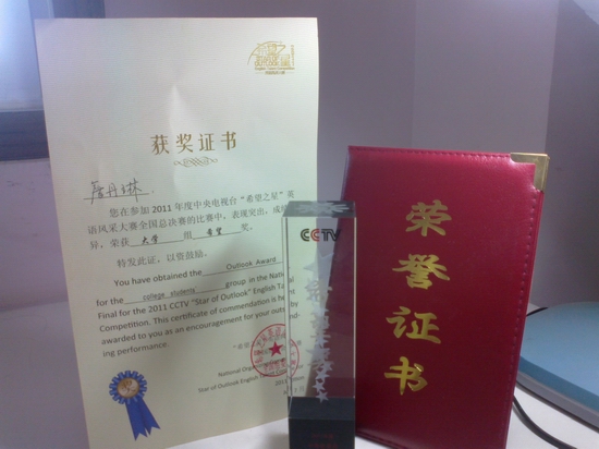 2011年“希望之星英语风采大赛” 湖北省赛区省内进阶比赛历时2个月,詹丹琳同学在外国语学院柯群胜老师、施海霞老师及钱茂华老师的指导下层层晋级,最终勇夺湖北省第一名桂冠,并获得代表湖北省参加在北京举行的全国大赛的资格。