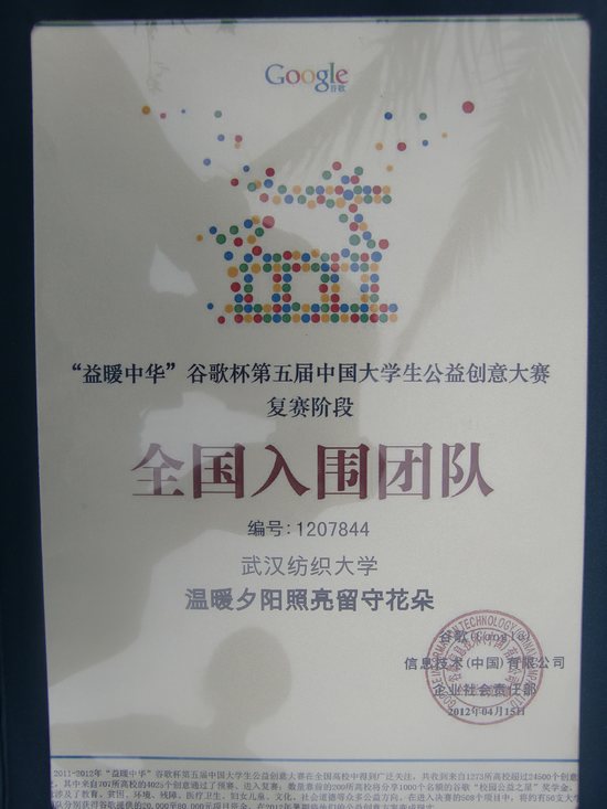 据悉,“益暖中华”谷歌杯中国大学生公益创意大赛是由谷歌发起,通过征集公益创意,资助获奖项目的形式,以促进公益事业发展,倡导大学生积极投身社会公益为目的的比赛。大赛共收到1273所高校提交的24500个项目,我校有30个项目进入预赛,其中3个项目进入初赛,最终外语学院杨凡负责的“温暖夕阳照亮留守花朵”项目以鲜明的社会关注主题、弘扬大爱无私的志愿者精神、活动取得的实际效果等脱颖而出,代表学校进入了复赛,获得全国入围团队奖,为学校争得了荣誉,也体现了我校学子良好的精神风貌。