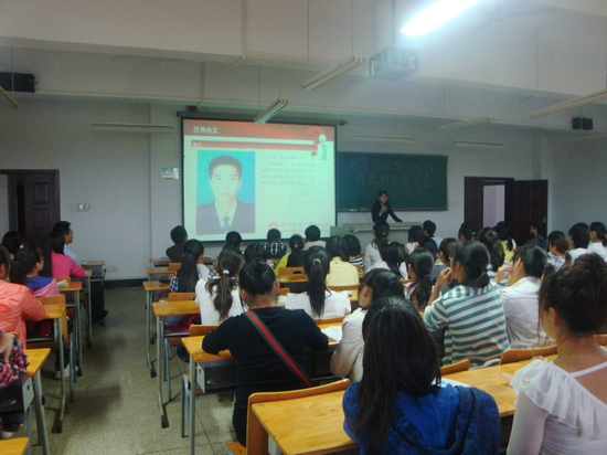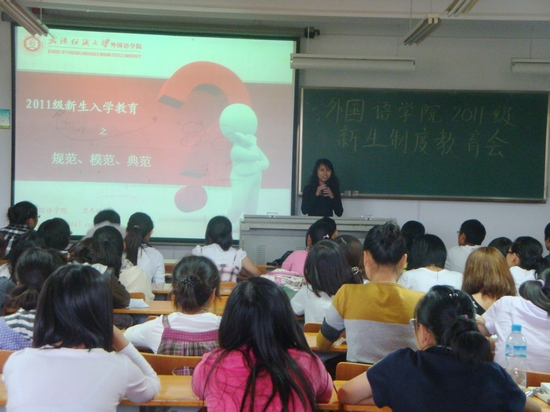 为使11级新生更好地适应大学生活,规范自身行为, 9月29日下午,外国语学院分党委副书记卫冬妹在07-221作了《规范、模范、典范》新生教育主题讲座,外国语学院2011级全体新生聆听了讲座。讲座由新生辅导员陈新川主持。