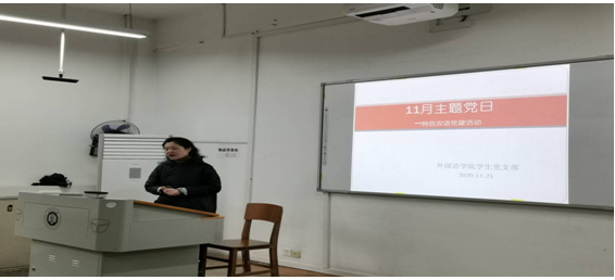 2020年11月25日下午,外国语学院在3号教学楼102教室开展了第三期双语特色支部主题党日活动。学院邀请了从英国访问学者回来的党员教师陈韵如参加主题党日活动。