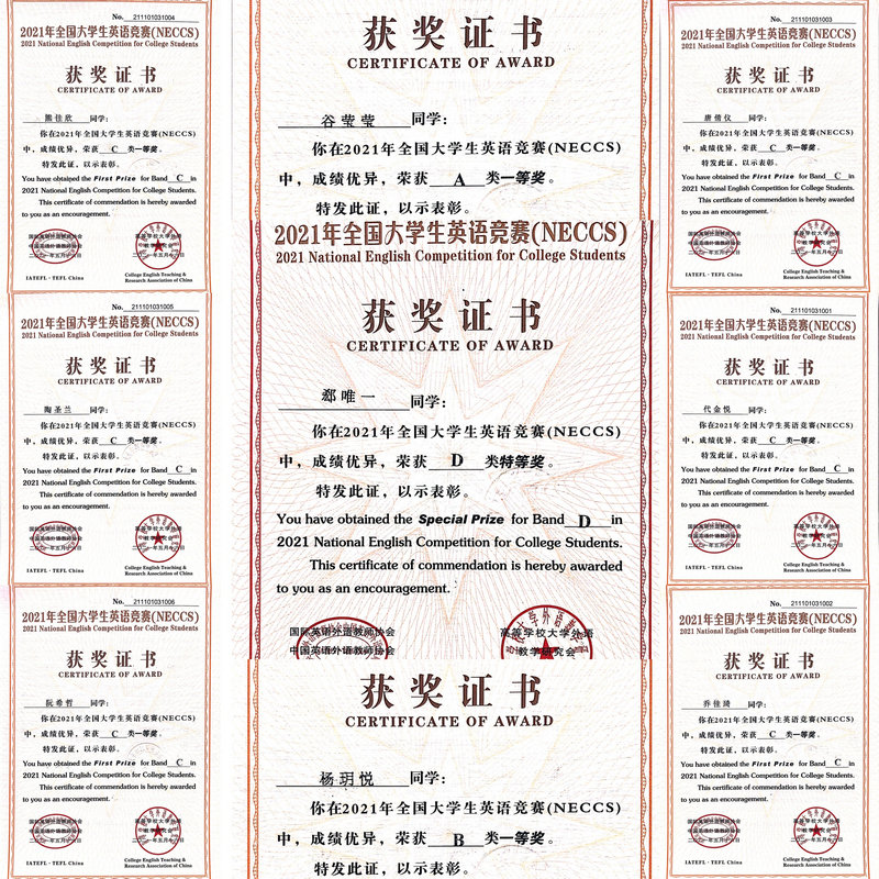 近日,从全国大学生英语竞赛组委会传来喜讯,我校郄唯一同学(环艺61901班)凭借扎实的英语基本功和英语综合运用能力,于2021年5月在华中师范大学举行的全国大学生英语竞赛决赛中斩获全国特等奖,另外8名同学获得全国一等奖,其中谷莹莹同学(研2017)获得A类一等奖,这是研究生首次获得全国大学生英语竞赛一等奖。49名同学获得全国二等奖,83名同学获得全国三等奖。