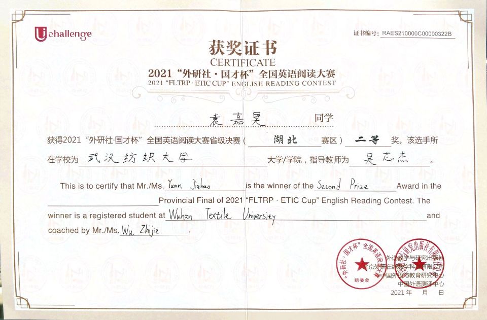 2021“外研社·国才杯”演讲、阅读、写作大赛自今年6月启动报名,历时将近5个月的时间,已经顺利完成校园初赛、湖北省复赛。在湖北省决赛中,我校计算机与人工智能学院20级学生袁嘉昊获得阅读大赛二等奖,商务英语专业19级学生黄昕婷以第一名的成绩斩获写作大赛特等奖,直接晋级国赛,将代表武汉纺织大学参加于12月8日在北京举办的全国总决赛。
