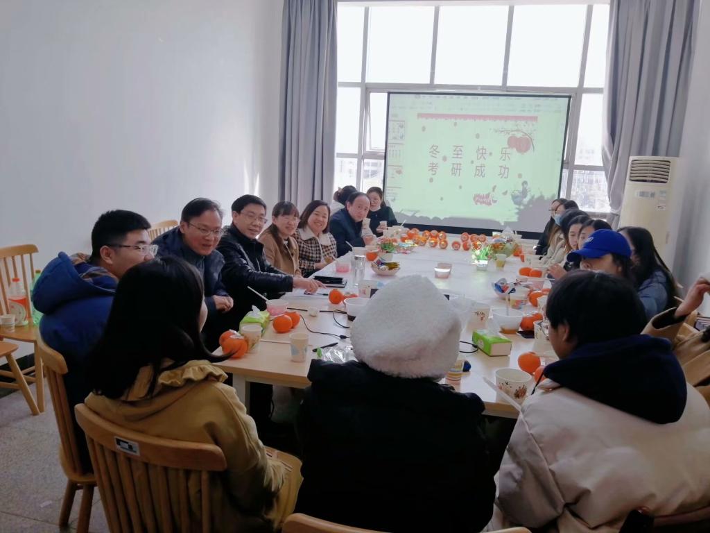在考研即将来临之际,为给考研学子鼓舞士气,舒缓备考压力,增强信心和动力,12月21日上午,外国语学院在崇文楼413会议室举办了主题为“冬至快乐,考研‘橙’功”的暖心活动,学院党委书记胡中原、院长谭燕保、副院长柯群胜、罗绮伦、副书记王芳和毕业生辅导员甘新敏、部分考研学生参与活动。