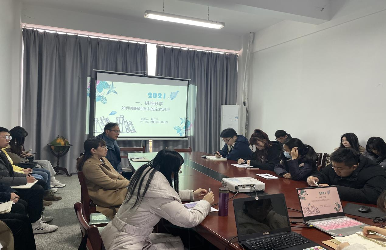 12月22日下午2点,武汉纺织大学外国语学院第31期“经纬译学”研究生论坛在04-313成功举办。本次论坛由MTI教育中心主任刘珊副教授主持,20级研究生赵江平和21级研究生呙新主讲,外国语学院院长谭燕保教授、副院长柯群胜教授、研究生导师赵伟副教授和全体MTI研究生参加了此次论坛。